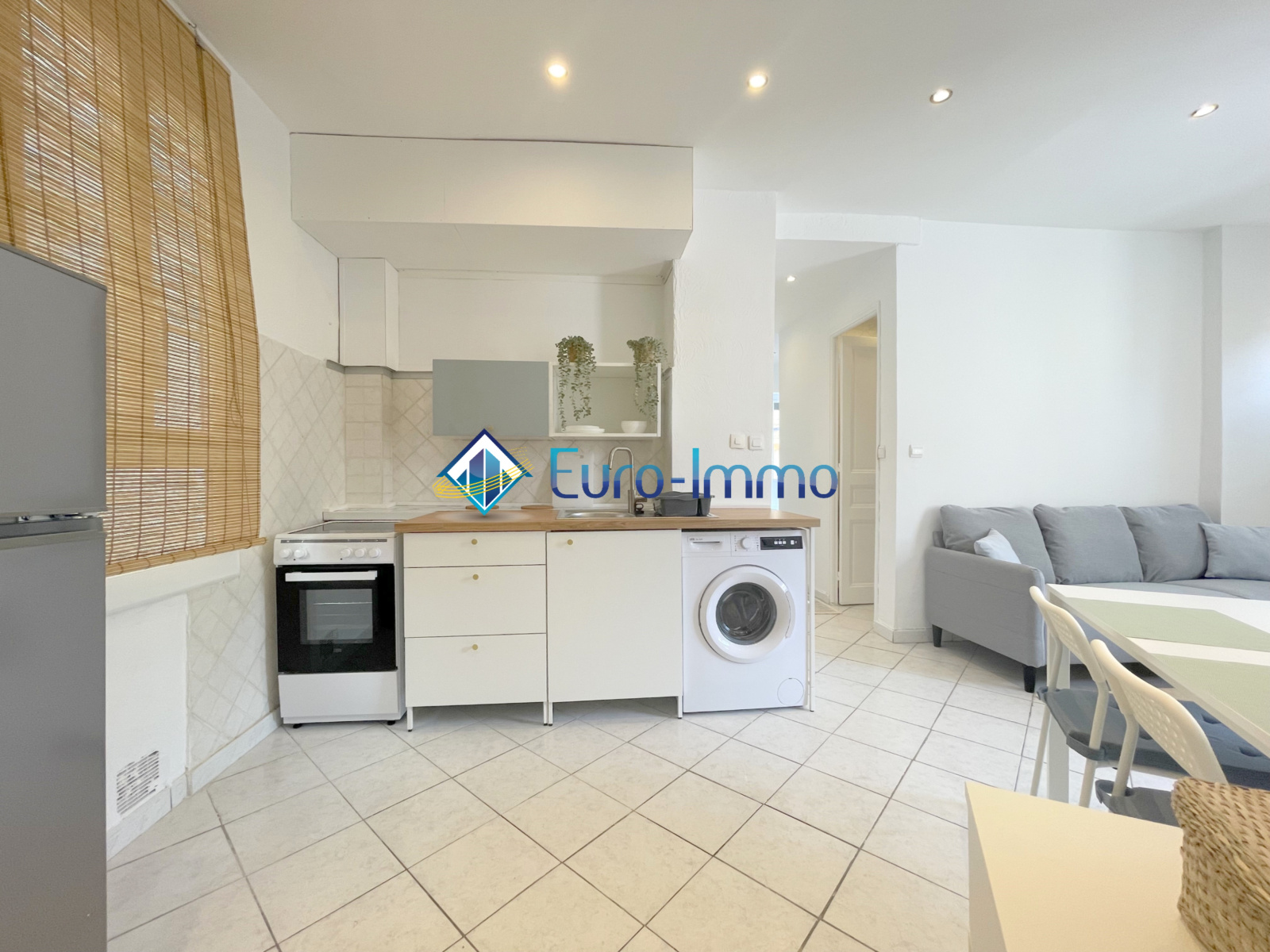 Cet appartement décoré avec goût, sis au 3eme et dernier étage (sans ascenseur) d'un petit immeuble se compose, d’une entrée, séjour avec cuisine ouvert équipée, chambre avec placard, petite pièce avec balcon pouvant servir de chambre ou de bureau, salle de douche avec WC.